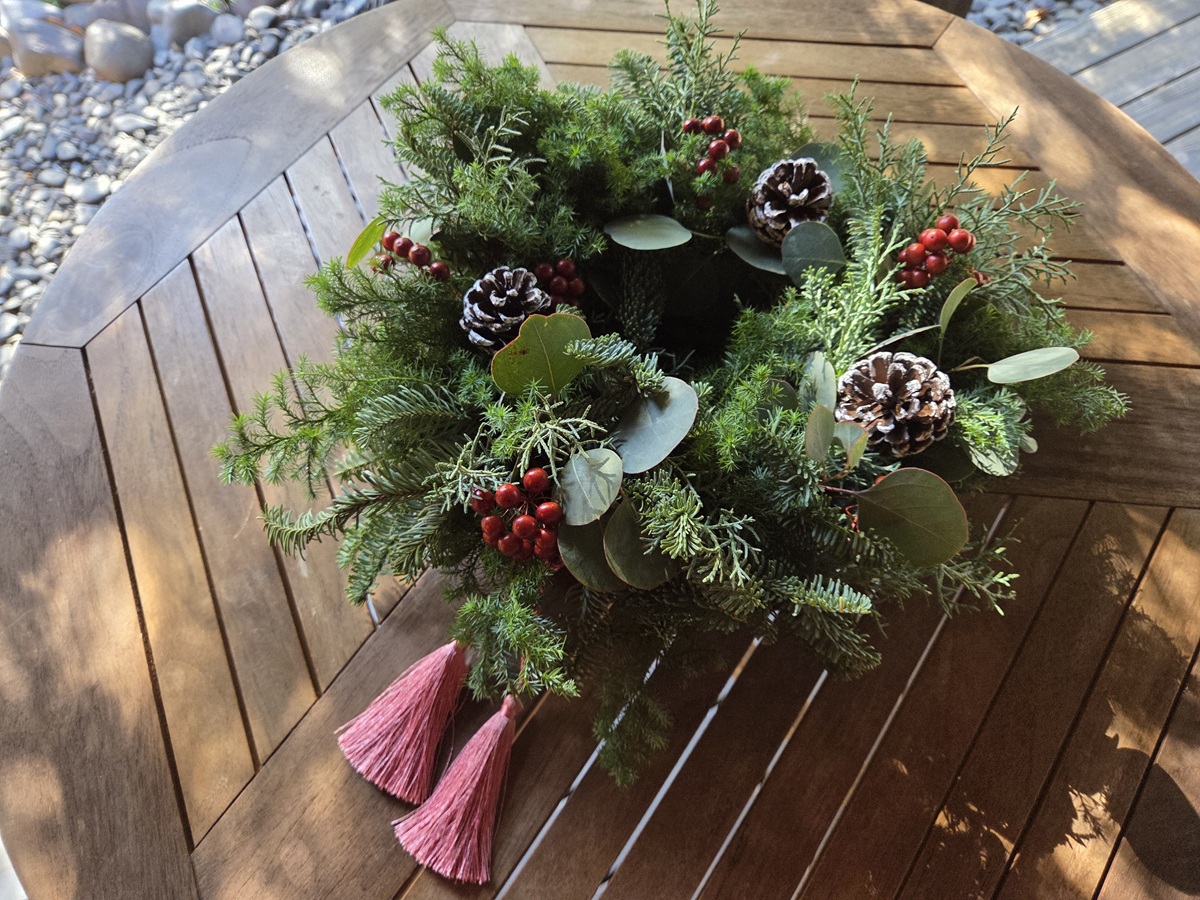 出来栄えはさておき、久しぶりに生の枝葉を触り、麻ひもでグルグルと輪に巻きつける工程はとても楽しく、何かを作る喜びで気持ちが上がりました。